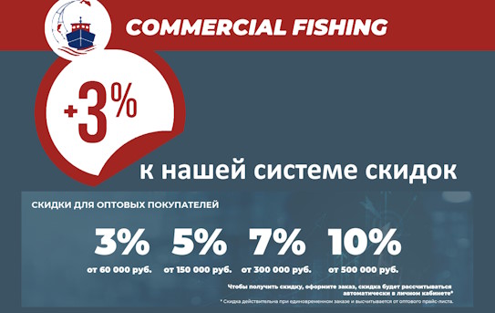 Дорогие партнёры, близится Новый год, и поэтому мы подготовили для вас особое предложение – на *все товары сайта Commercial Fishing будет действовать дополнительная скидка +3% (при размещении заказа от 30000 рублей) к нашей действующей системе скидок.